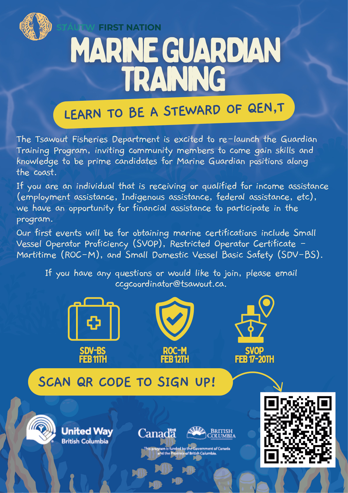 The SȾÁUTW̱ Fisheries Department is excited to launch the Marine Guardian Training Program, inviting community members to learn skills and help protect our marine environment. In the coming months, we’ll offer training to prepare you to become a Marine Guardian and help care for the waters that sustain us all.